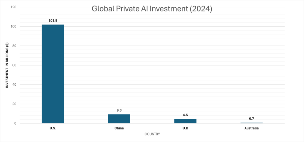 Investment Deficit: Australia's $0.7 billion private AI investment falling significantly behind the US ($109.1Billion), AUD $166.4 billion (Australian AI Report, 2024).