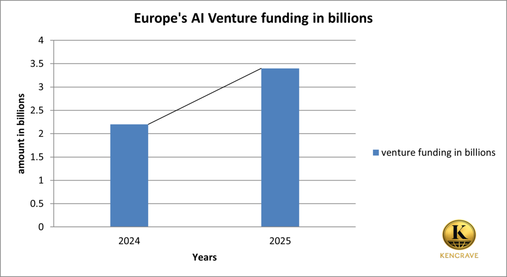 Europe's AI venture funding growth chart 2024 to 2025 – a bar graph showing a billion-dollar increase. Source: Silicon Canals