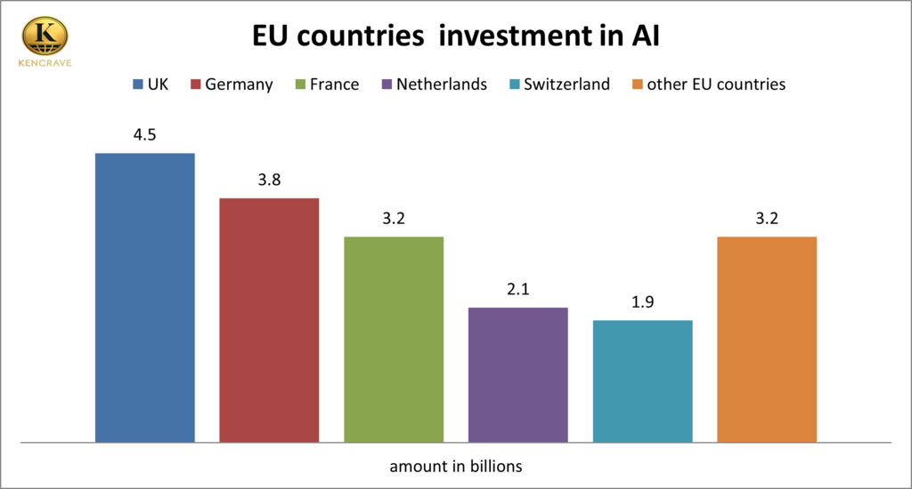 EU countries AI investment comparison chart – UK leads with €4.5B, followed by Germany, France, Netherlands and Switzerland.