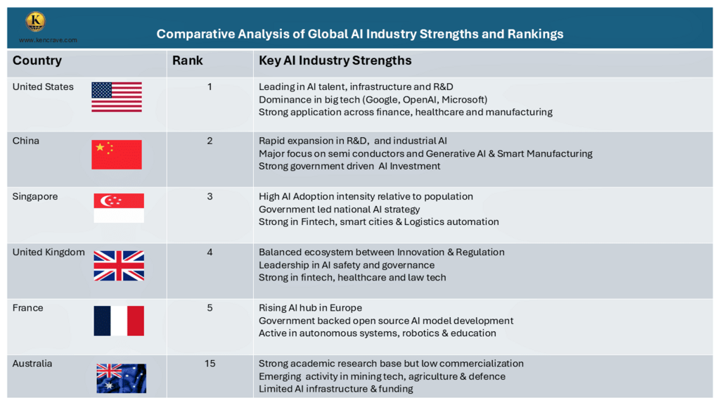 Global AI industry rankings and strengths by country - USA, China, Singapore, UK, France, Australia, highlighting leadership in AI talent, R&D, fintech, smart manufacturing, and government strategies.