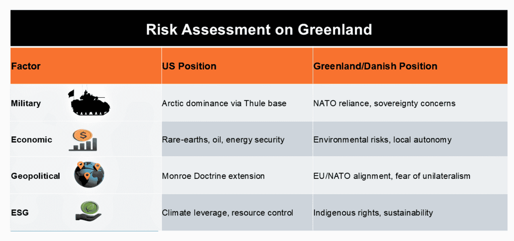 Greenland risk assessment table comparing US vs Denmark military economic geopolitical ESG positions.