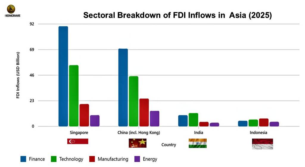 2025 FDI inflows by sector in Asia in Finance, Technology, Manufacturing, Energy across Singapore, China, India, Indonesia.