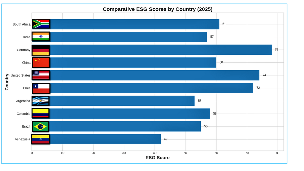 A chart of comparative ESG Scores in Latin America and Global Powers (2025). Sources: ISESG Global ESG Ranking, KPMG Chile ESG Transparency Report, Anuário Integridade ESG – Brazil, Pacto Global Colombia, SDG Index – Argentina, SDG Index – United States, IBISWorld Germany ESG Rankings, India360 ESG Risk Ratings, NenPower ESG Impact – China, IRAS ESG Assurance – South Africa