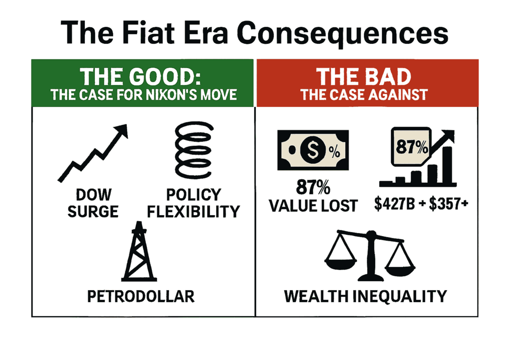 Infographic comparing pros and cons of Nixon ending the gold standard in 1971, highlighting Dow growth, policy flexibility, petrodollar benefits vs. dollar devaluation, rising U.S. debt, and wealth inequality.