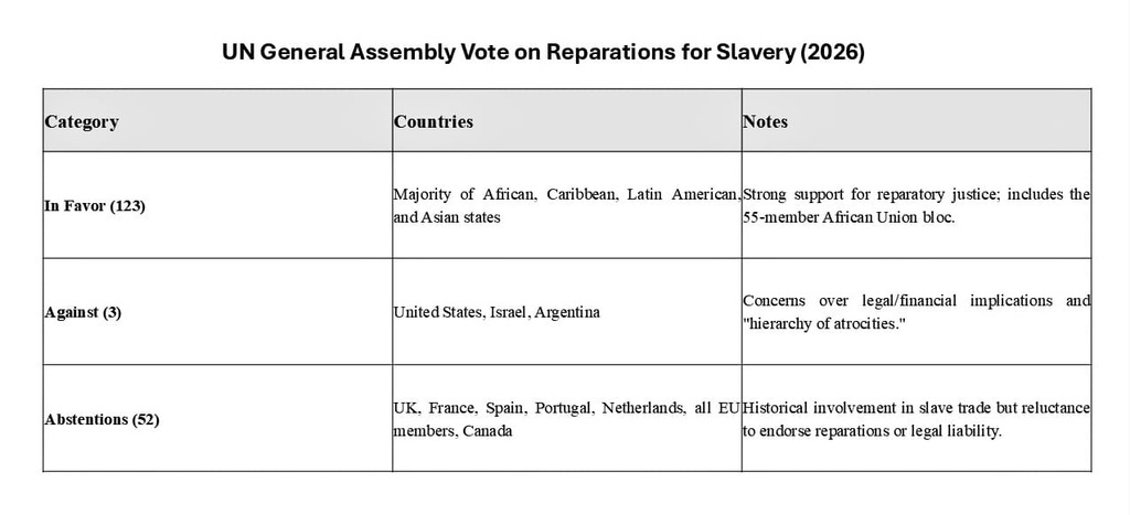 Bottom Line The 2026 UN slavery reparations resolution marks a turning point in global discourse, shifting from symbolic recognition to structured demands. However, its real-world impact will depend on political will, legal developments, and sustained international pressure.