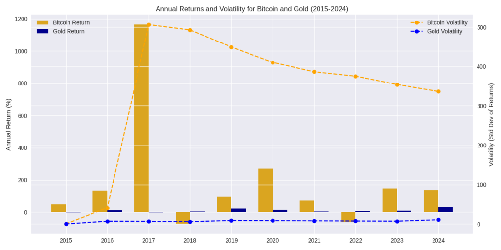 Chart comparing Bitcoin and Gold annual returns (bars) and volatility (lines) from 2015- 2024: Bitcoin’s sharp return spikes (2017, 2020) and high volatility versus Gold’s steady, low-risk profile.