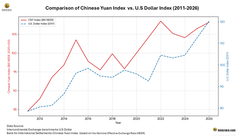 The sharp rise in the DXY (approaching 120 by 2026) reflects an exceptionally strong U.S. dollar. Interestingly, the CNY Index has remained elevated (around 108) during this same period. This suggests that the yuan is not just following the dollar but is maintaining its own independent strength against other major currencies like the euro, yen, and British pound.