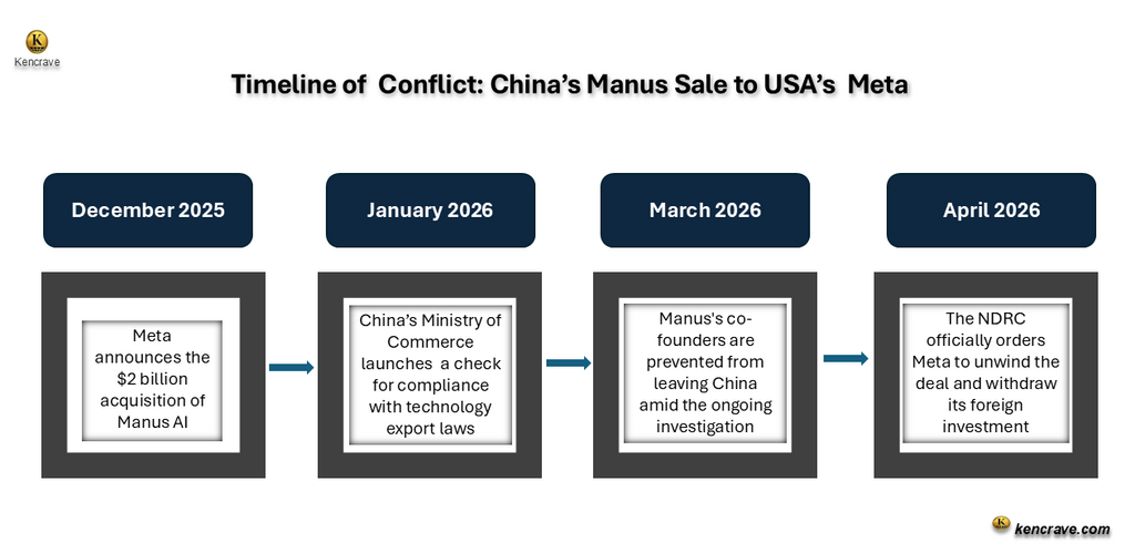 Timeline showing key events in the Meta-Manus AI acquisition dispute, from Meta’s 2025 purchase announcement to China’s 2026 order to unwind the deal.