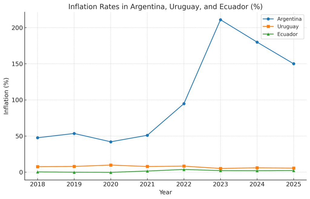 Source: World Bank and national central bank statistics (2018 - 2025). Line graph comparing inflation rates of Argentina, Uruguay, and Ecuador between 2018 and 2025. Argentina shows steep volatility, Uruguay remains stable under 10%, and Ecuador, dollarized since 2000, stays near zero to low single digits.