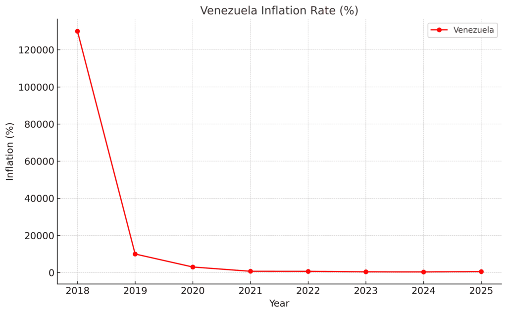 World Bank and regional press estimates (2018 - 2025). Line graph showing Venezuela’s inflation from 2018 to 2025. The chart highlights a hyperinflation spike in 2018 (130,000%+) and a sharp decline in subsequent years, though inflation remains persistently high in the hundreds of percent