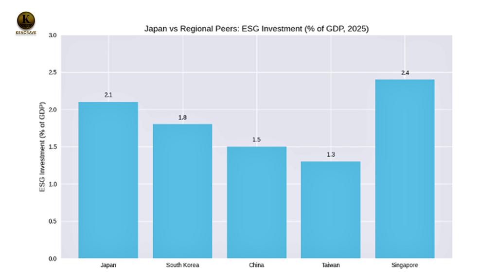 Japan’s ESG investment reached 2.1% of GDP in 2025, reflecting strong government and corporate interest in sustainability. However, regional comparisons reveal a mixed picture:
