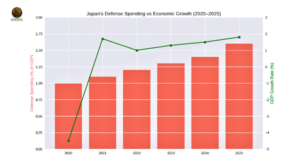 Dual-axis chart showing Japan’s rising defense spending as % of GDP alongside fluctuating GDP growth rates from 2020 to 2025. Red bars represent defense spending; green line tracks economic growth.