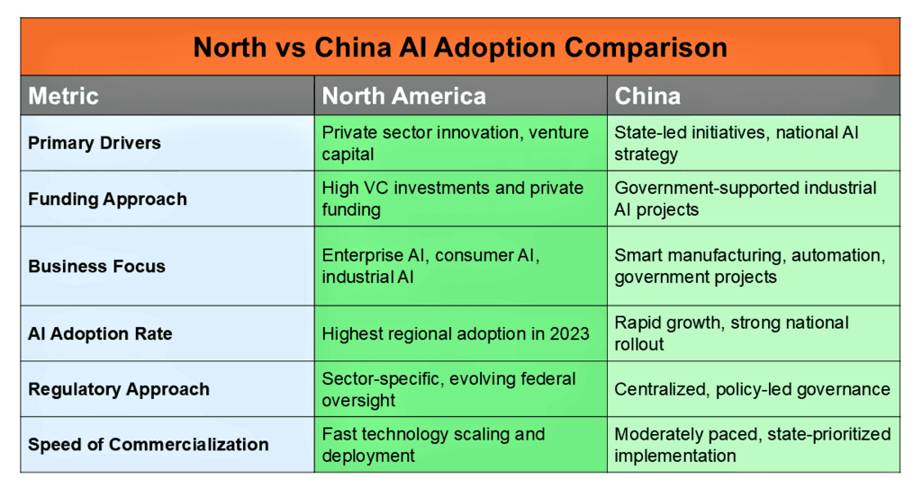 North America vs China AI adoption metrics: innovation drivers, funding, regulation, and commercialization speed