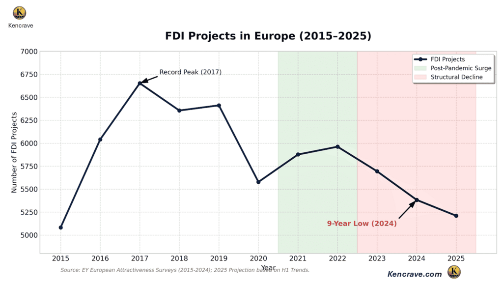 FDI projects in Europe 2015 to 2025 line graph showing record peak in 2017, post‑pandemic surge, and projected structural decline to 2024 low.