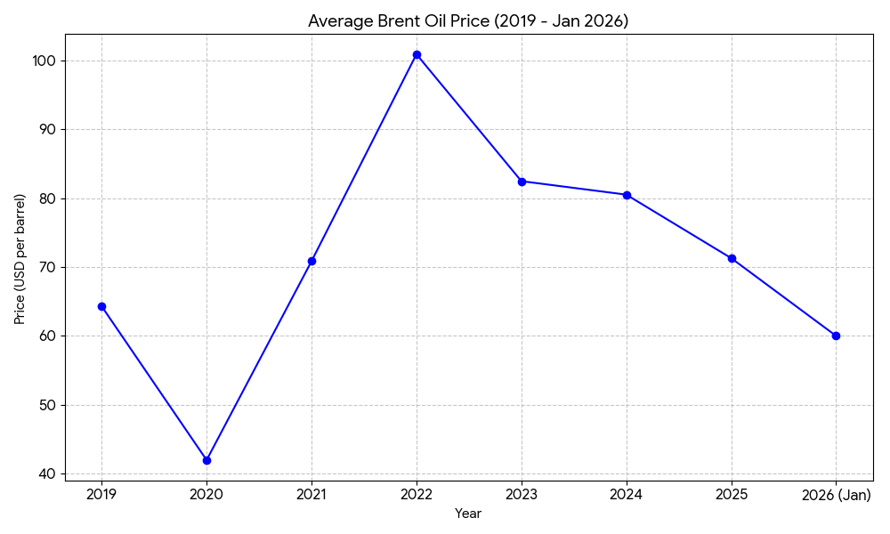 Average Brent oil price 2019–2026 line chart, global crude market trends, pandemic slump, 2022 peak, and 2025 decline. Sources: Statista and US EIA