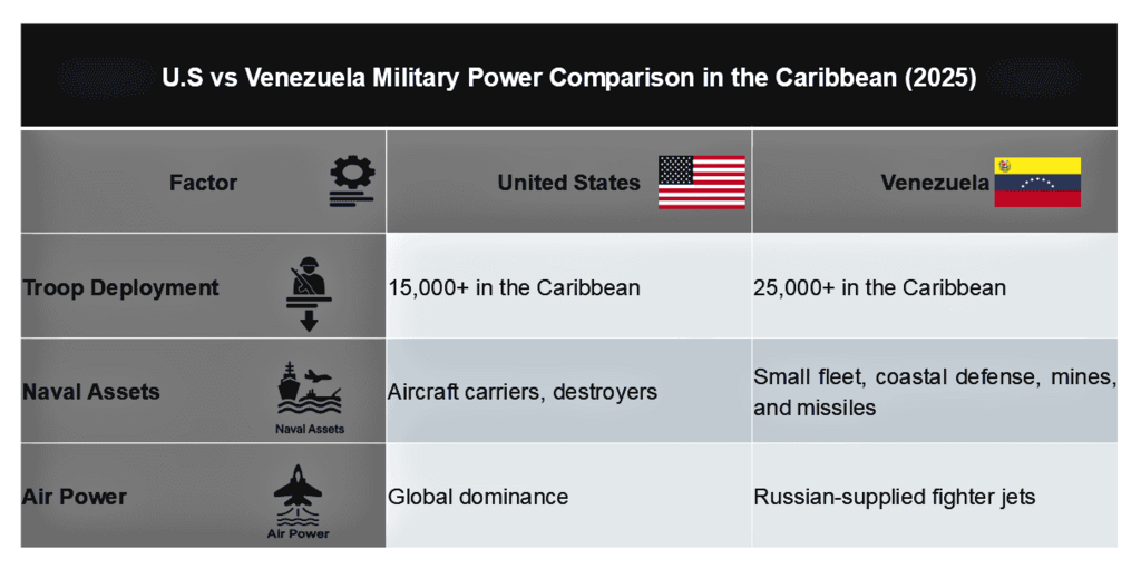 US vs Venezuela military power comparison Caribbean 2025 chart, troop deployments, naval assets, air power analysis.