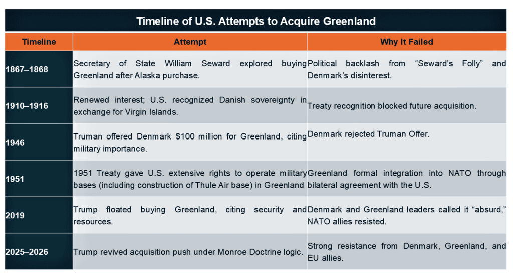 US attempts to acquire Greenland timeline historical failures and Denmark resistance.