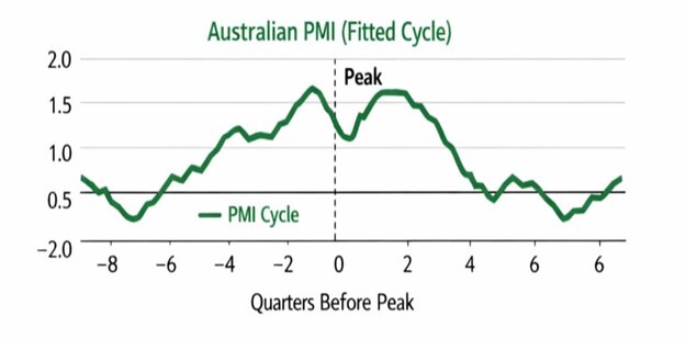 Australian PMI fitted cycle chart showing business activity trends before and after peak, highlighting economic growth and contraction phases.