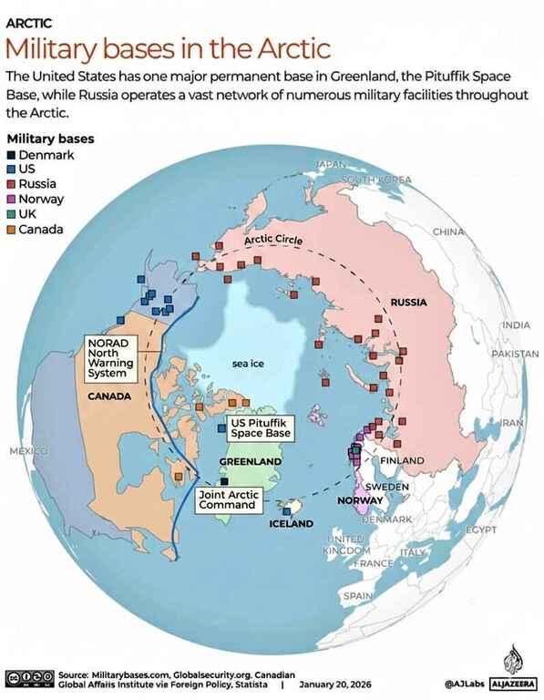 2026 Arctic military base map showing strategic installations by Russia, US, Canada, Denmark, Norway, and UK across the polar region, highlighting Pituffik Space Base, NORAD, and Joint Arctic Command. Source: Aljazeera.