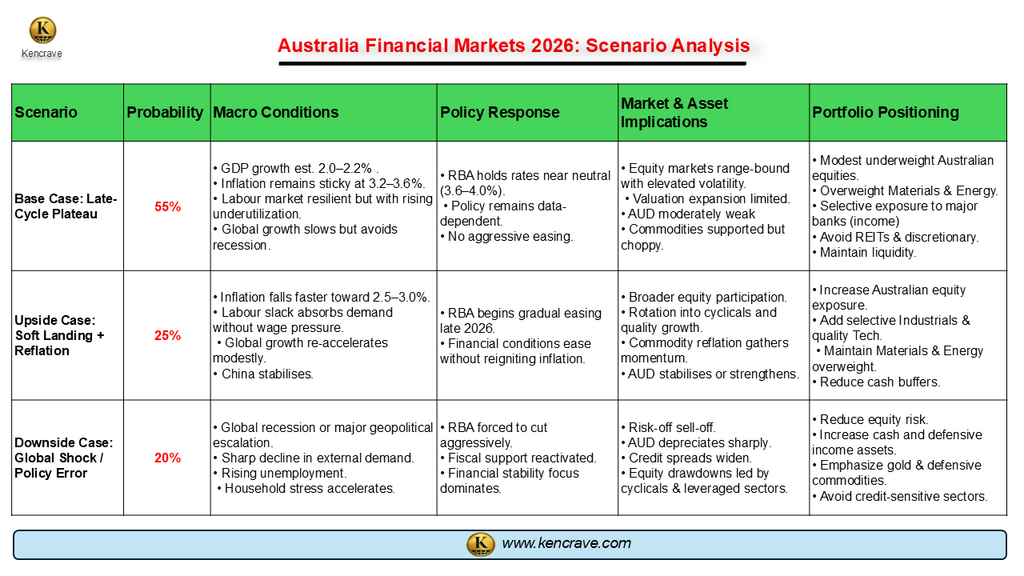 Scenario analysis chart of Australia’s 2026 financial markets showing base case, upside soft landing, and downside global shock with probabilities, policy responses, and portfolio strategies.