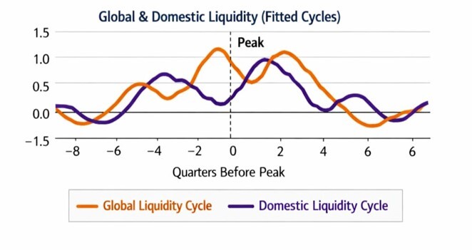 Comparative chart of global liquidity cycle and domestic liquidity cycle, showing synchronized peaks and cyclical market liquidity trends across quarters.