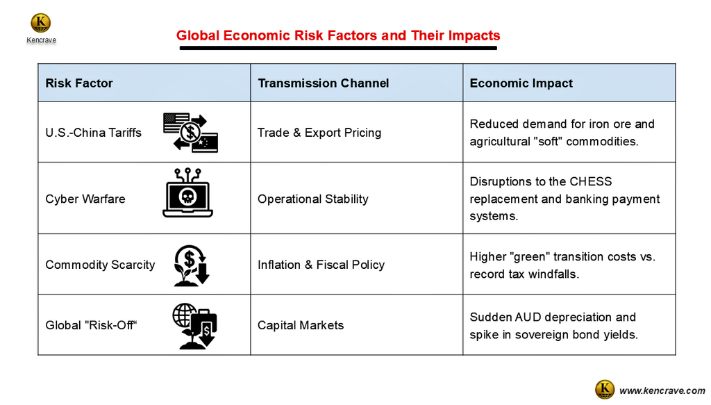 Australia’s open economy status makes it a high-beta exposure to global stability. Escalations in trade or military conflict could rapidly transmit volatility through currency depreciation and higher borrowing costs.