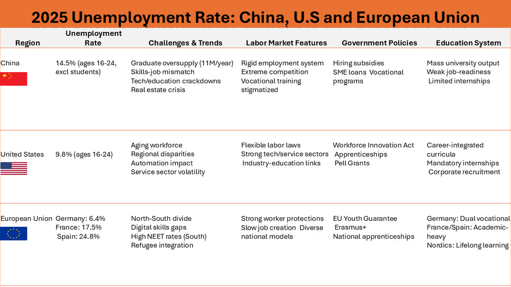 Key Observations: China's Paradox Officially declining rate (14.5%) masks severe structural issues: 11M annual graduates flood markets where 38% of youth hold degrees vs. 25% job market demand. EU's Extreme Divergence Germany's vocational model keeps youth unemployment low (6.4%), while Spain's 24.8% reflects rigid labor markets and tourism dependency.