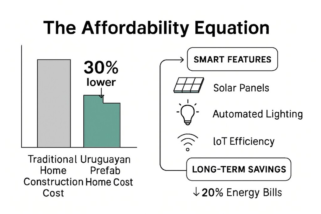 A 2D vector infographic titled “The Affordability Equation” a bar chart and a flowchart indicating how Uruguay has managed to cut costs in affordable smart homes