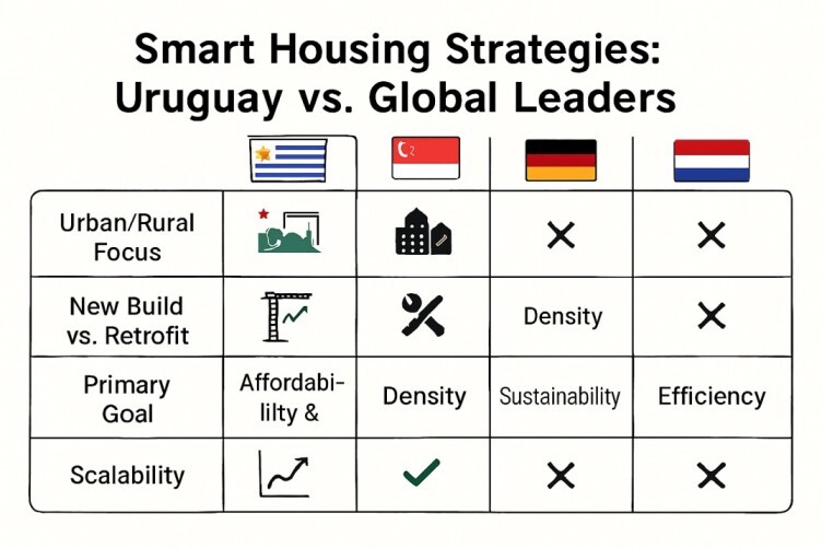 Infographic comparing smart housing strategies in Uruguay, Singapore, Germany, and the Netherlands across affordability, scalability, and sustainability