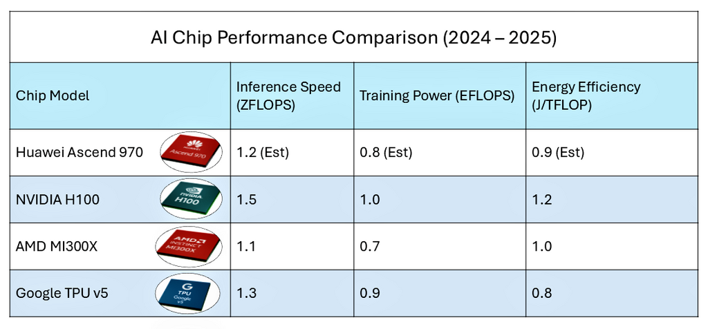 Here’s how the Ascend 970 compares to leading AI chips from NVIDIA, AMD, and Google across inference speed, training power, and energy efficiency.