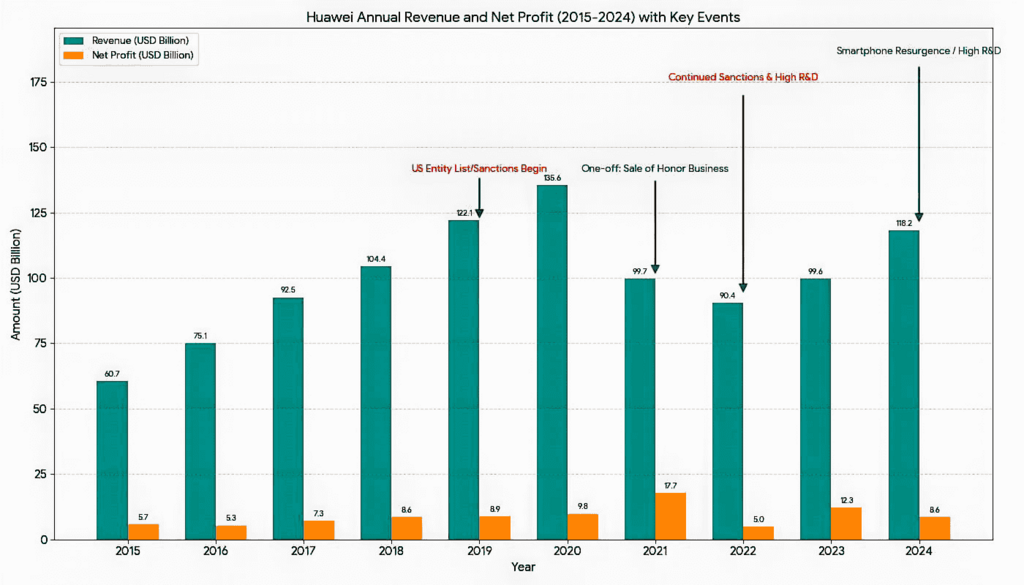 A graph showing Huawei Technologies Co., Ltd. showing Revenue and Net Profit (USD Billion) from 2015 to 2024 with key events affecting financial performance, including US Entity List Sanctions (2019) and the one -off profit from the Honor business sale (2021) are highlighted.