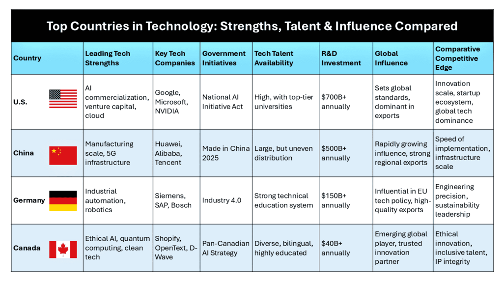 Global Tech Comparison Table: Comparative analysis of tech strengths, companies, and innovation across the U.S., China, Germany, and Canada.